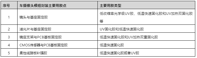 圖表20. 車(chē)載攝像頭模組封裝主要用膠點(diǎn)及用膠類(lèi)型