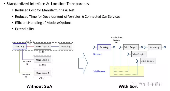 因此與傳統(tǒng)的在單片系統(tǒng)里面做的傳感、信號(hào)邏輯判斷執(zhí)行,在基于SOA系統(tǒng)里面在中間件里面但開了,并且導(dǎo)入了標(biāo)準(zhǔn)的API。導(dǎo)入了中間件,服務(wù)提供者和服務(wù)使用者之間的連接是在運(yùn)行時(shí)建立的 ,和之前相比很多的功能在系統(tǒng)設(shè)計(jì)時(shí)建立完整的邏輯體系。