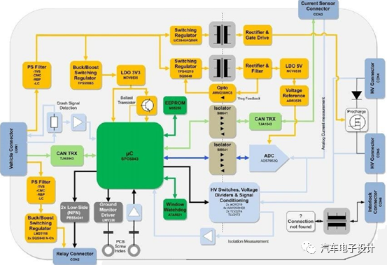 5)電源管理電路和EMC抑制:電池管理系統(tǒng)從電池模組和12V電池上驅(qū)電,通過合理的保護電路來管控不同節(jié)點的電源情況。