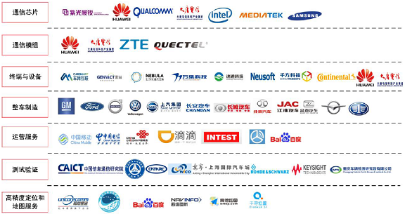 C-V2X產(chǎn)業(yè)鏈從狹義上來說主要包括通信芯片、通信模組、終端與設(shè)備、整車制造、測試認(rèn)證以及運(yùn)營服務(wù)等環(huán)節(jié)。