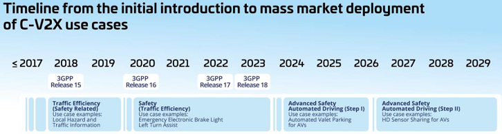 可以看到繼2020年C-V2X第一階段LTE-V2X部署應(yīng)用,未來3-4年是一個發(fā)展階段。同時,針對增強(qiáng)安全應(yīng)用和自動駕駛,業(yè)界預(yù)計將于2024-2027年開始商用部署。
