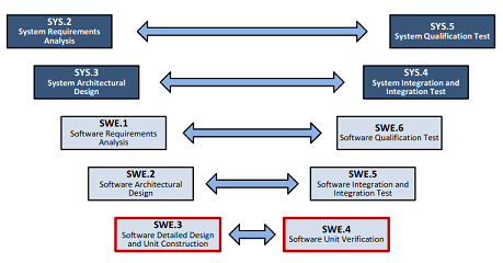 ASPICE 建立在 V 模型之上,它需要與每個開發(fā)階段相對應(yīng)的測試階段。 這是一個嚴格的模型,需要嚴格的評估以確保持續(xù)的評估和發(fā)展。下圖是ASPICE中定義的典型開發(fā)流程: