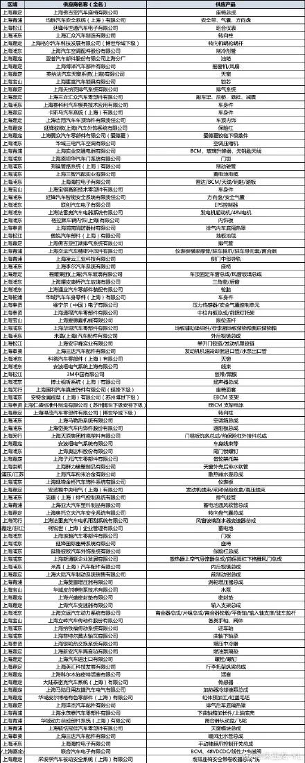 由于上海有著非常完整的汽車零部件產(chǎn)業(yè)鏈,和長(zhǎng)三角的零部件制造基地一起為中國(guó)的汽車工業(yè)輸送著足夠有性價(jià)比的零部件。下面是排摸的基于上汽集團(tuán)體系下的產(chǎn)品供應(yīng)鏈的情況。