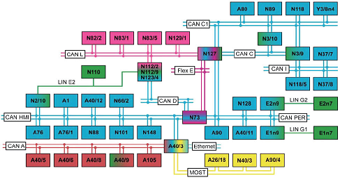 CAN A。車載智能信息系統(tǒng) (CAN);CAN C. 發(fā)動(dòng)機(jī)控制器區(qū)域網(wǎng)絡(luò) (CAN);CAN C1. 傳動(dòng)系統(tǒng)控制器區(qū)域網(wǎng)絡(luò) (CAN);CAN D. 診斷控制器區(qū)域網(wǎng)絡(luò)(CAN);CAN HMI. 用戶界面控制器區(qū)域網(wǎng)絡(luò) (CAN);CAN I. 傳動(dòng)系傳感器控制器區(qū)域網(wǎng)絡(luò) (CAN);CAN L. 混合動(dòng)力控制器區(qū)域網(wǎng)絡(luò) (CAN);CAN PER. 外圍設(shè)備控制器區(qū)域網(wǎng)絡(luò) (CAN);Ethernet. 以太網(wǎng);Flex E. 底盤 FlexRay;LIN E2. 座椅承載識(shí)別區(qū)域互聯(lián)網(wǎng) (LIN);LIN G1. 左側(cè)大燈局域互聯(lián)網(wǎng) (LIN);G2. 右側(cè)大燈局域互聯(lián)網(wǎng) (LIN);MOST. 多媒體傳輸系統(tǒng)。2. 車際網(wǎng)絡(luò)