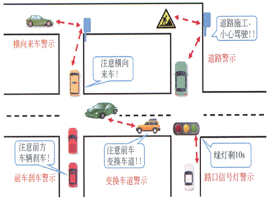 DSRC是基于美國(guó)電氣電子工程師協(xié)會(huì)(IEEE),在IEEE802.11 的Wi-Fi技術(shù)基礎(chǔ)上改進(jìn)制定的IEEE802.11p標(biāo)準(zhǔn)和IEEE1609標(biāo)準(zhǔn)的V2V和V2I通信協(xié)議,是比較成熟、高效的無線通信系統(tǒng)技術(shù),它是智能交通系統(tǒng)的重要基礎(chǔ)之一,目前已被歐洲、日本等國(guó)汽車制造企業(yè)采用并完善。我國(guó)在高速公不停車收費(fèi)設(shè)備(ETC)也采用該項(xiàng)技術(shù)。DSRC通信在5.9GHz附近的頻段上,專門將車與車、車與道路基礎(chǔ)設(shè)施有機(jī)連接,實(shí)現(xiàn)在數(shù)百米的范圍內(nèi)對(duì)高速行駛的車輛進(jìn)行識(shí)別和雙向通信,提供實(shí)時(shí)圖像、語音和數(shù)據(jù)信息傳輸,保證通信鏈路的低時(shí)延和低干擾以及系統(tǒng)的可靠性。例如DSRC在有效通信距離范圍內(nèi),本車輛通過DSRC以10Hz的頻率,向路上其他車輛發(fā)送位置、車速、方向等信息;同時(shí)本車輛還能收到其他車輛所發(fā)出的信號(hào),在必要時(shí)(例如馬路轉(zhuǎn)角有車輛駛出,或前方車輛突然緊急剎車,變換車道的情況發(fā)生)車內(nèi)信號(hào)裝置會(huì)以閃爍、語音提醒或座椅、方向盤振動(dòng)等方式提醒駕駛員注意,采取必要安全措施,如圖9所示。