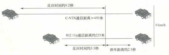 圖中例子是汽車以140km/h速度行駛的時(shí)候,采用LTE-V2X的汽車比采用DSRC技術(shù)的汽車擁有額外的5.9s(9.2s~3.3s)來決定是否剎車。