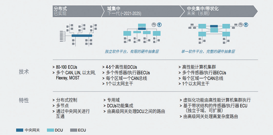 2015年,博世提出了眾所周知的電子電氣架構(gòu)技術(shù)路線圖, 并描繪了未來電子架構(gòu)的主要特征及可能的實(shí)現(xiàn)時(shí)間點(diǎn)。對(duì)于這一路線圖本身無需再做過多介紹,但其中的兩個(gè)重要標(biāo)志性節(jié)點(diǎn)依然值得強(qiáng)調(diào),即DCU或HPC的出現(xiàn),以及統(tǒng)一的基礎(chǔ)軟件平臺(tái)的出現(xiàn),標(biāo)志著EEA的本質(zhì)進(jìn)化。盡管由于車企的解決方案各不相同,其對(duì)EEA進(jìn)化的階段定義可能有所不同,但羅蘭貝格認(rèn)為EEA的發(fā)展整體會(huì)經(jīng)歷三大階段:分布式架構(gòu)、基于域的集中式架構(gòu)和基于域融合的帶狀架構(gòu),如圖4。