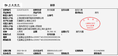 2022年6月30日,我司收到上海市閔行區(qū)七寶鎮(zhèn)人民政府企業(yè)扶持專項(xiàng)首筆資金8萬(wàn)元,預(yù)計(jì)下半年會(huì)獲得剩余尾款7萬(wàn)元。