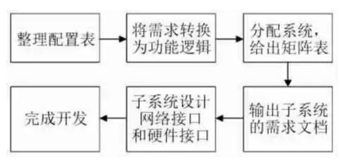 傳統(tǒng)EE架構的開發(fā)流程如圖1所示,由市場首先對車型定位,針對定位尋找相應的或更高配置的主流車型進行對標,主要對標其外形、內飾、靜態(tài)功能和動態(tài)功能并牽頭全員填寫競品分析表,將分析結果整合并調研用戶需求后整理輸出配置表、技術梳理配置表,找到各自的相關項,轉換為技術方案,將配置表分解為多個功能邏輯,再將功能邏輯分配給多系統(tǒng),輸出網絡通信需求表,根據需求表,輸出子系統(tǒng)的需求文檔,文檔中寫明I/O、人機交互界面、性能要求、應用場景等,子系統(tǒng)根據功能分配自己的網絡接口和硬件接口,最后完成系統(tǒng)的原理圖和網絡開發(fā)。