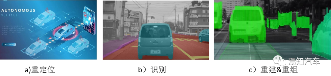 “場(chǎng)景重建”意味著從視頻序列推斷場(chǎng)景中的幾何體,包括車(chē)輛在場(chǎng)景中的位置?!耙刈R(shí)別”是一個(gè)術(shù)語(yǔ),用于將語(yǔ)義標(biāo)簽附加到視頻圖像或場(chǎng)景的各個(gè)識(shí)別對(duì)象中,識(shí)別中包括各種不同的層次結(jié)構(gòu)?!白攒?chē)重新定位”是指車(chē)輛相對(duì)于其周?chē)h(huán)境的位置識(shí)別和度量定位?!瓣P(guān)鍵目標(biāo)重組”是將重定位、識(shí)別、重建形成的三個(gè)組成部分信息重新整合成統(tǒng)一表示的方法。