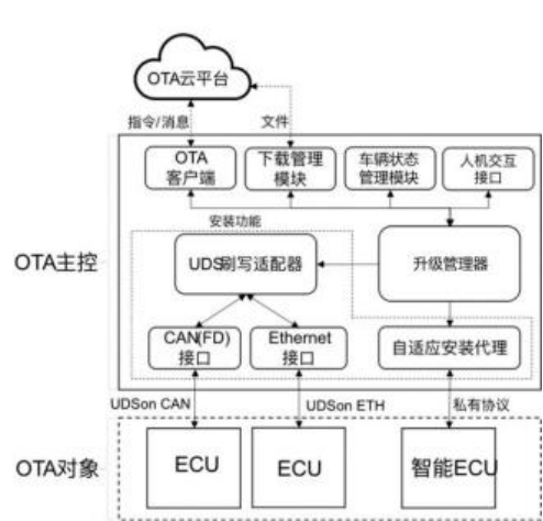 ② 車輛控制:對(duì)于影響車輛安全的升級(jí),整個(gè)升級(jí)過程需要保持在一種安全狀態(tài),因此, OTA 主控需要具備一定車輛功能控制能力,根據(jù)不同的升級(jí)類型,控制車輛的功能狀態(tài)。