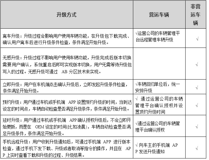 基于實(shí)際業(yè)務(wù)要求,各家 OEM 的 OTA 人機(jī)交互方式各有差異,本節(jié)共總結(jié) 6 種主流升級(jí)方式,并針對(duì)營運(yùn)車輛與非營運(yùn)車輛使用性質(zhì)不同,分別展開分析,具體如表 2-10 所示。