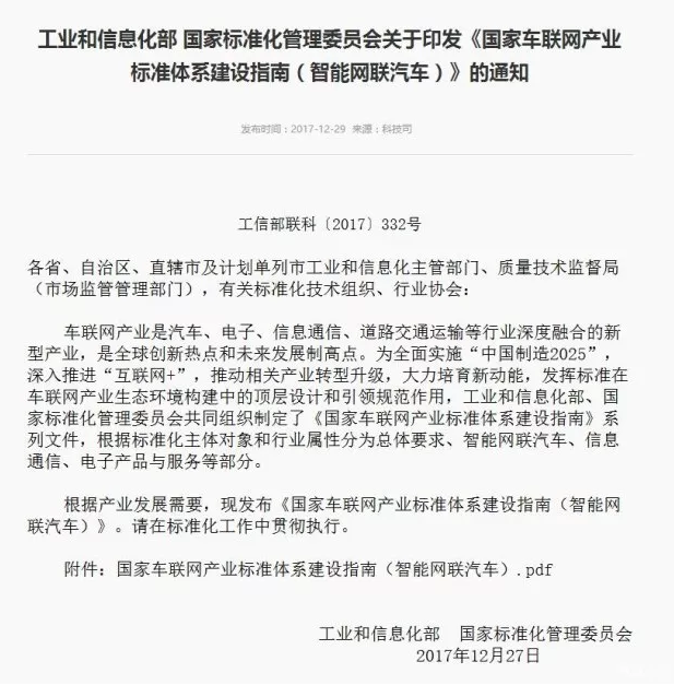 日前,工業(yè)和信息化部國家標準化管理委員向各省、自治區(qū)、直轄市及計劃單列市工業(yè)和信息化主管部門、質(zhì)量技術監(jiān)督局(市場監(jiān)管管理部門),有關標準化技術組織、行業(yè)協(xié)會下發(fā)了《國家車聯(lián)網(wǎng)產(chǎn)業(yè)標準體系建設指南(智能網(wǎng)聯(lián)汽車)》的通知。